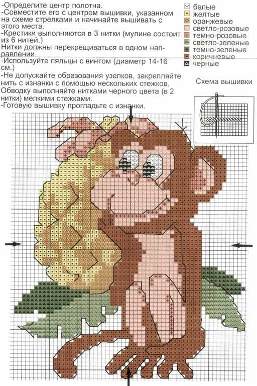 Для вышивки обезьянки используйте сочетание различных цветов, чтобы придать работе объем и оживить рисунок.