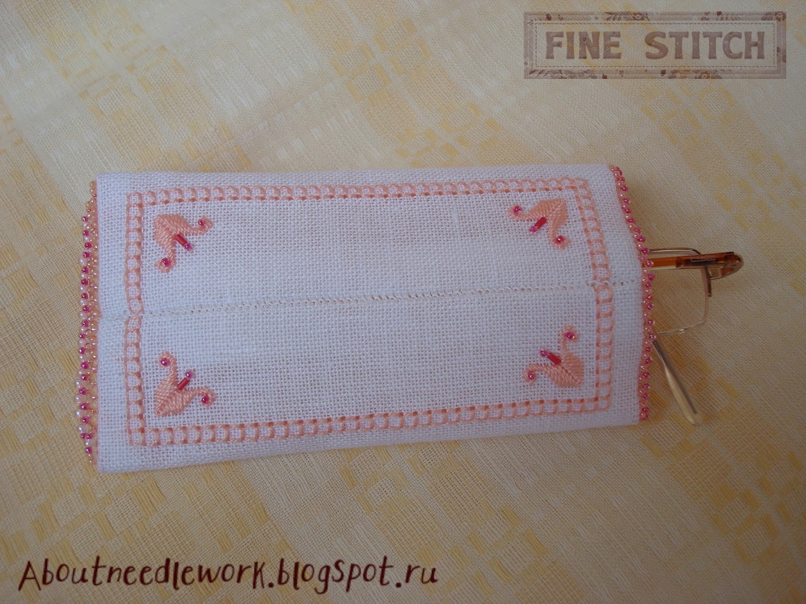 Не забывайте об уходе за готовой вышивкой. Очечник можно стирать вручную в теплой воде с мягким моющим средством. По окончанию стирки аккуратно просушите его, не выкручивая и не складывая. При необходимости можно аккуратно прогладить очечник с изнаночной стороны при низкой температуре утюга.