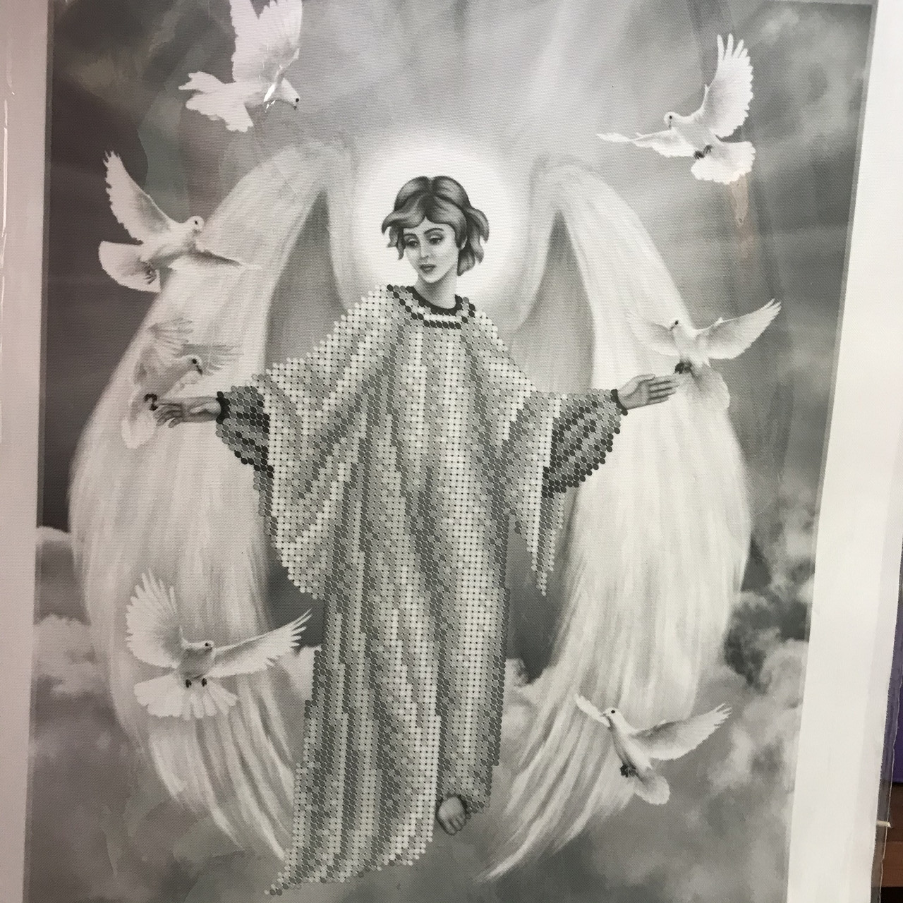 Не забывайте про равномерность стежков, чтобы изображение ангела-хранителя выглядело ровным и аккуратным.
