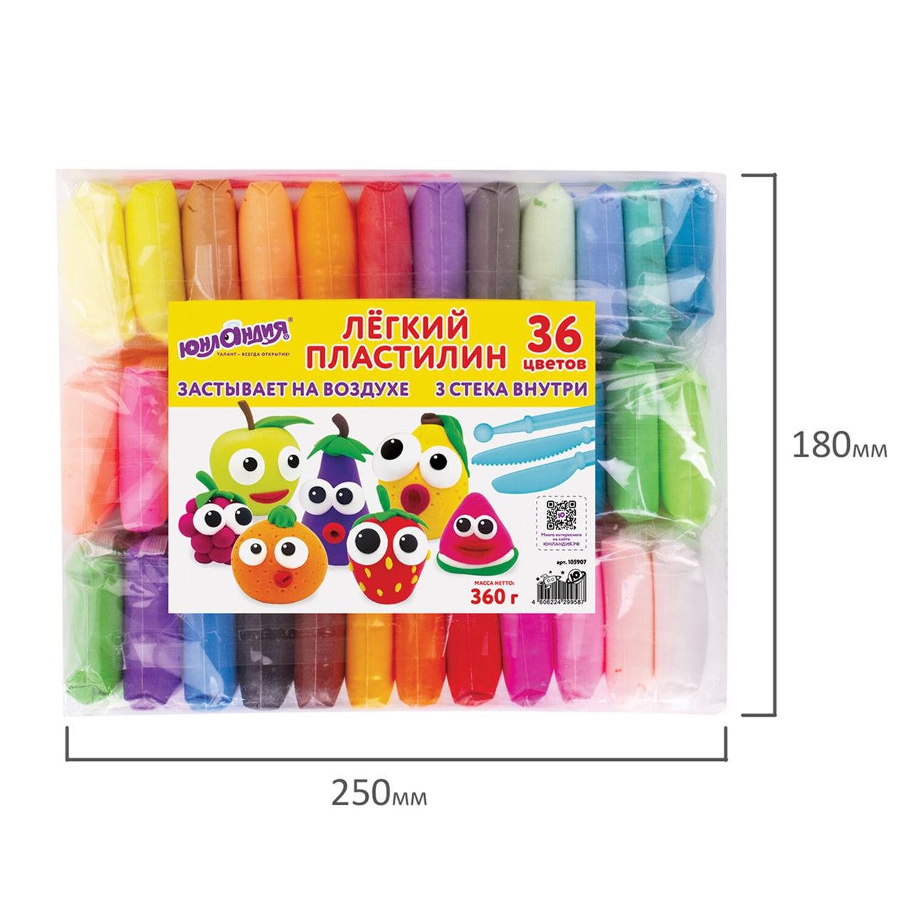 Пластилин супер лёгкий воздушный застывающий 36 цветов, 360 г, 3 стека, ЮНЛАНДИЯ, 105907